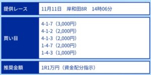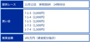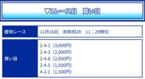 ただ競艇と違い的中率はグッと落ちるのでこの辺りの1発検証がどれくらい参考になるかは不明ですが参考になる部分もあるかと思うので、いつも通りのルールで。