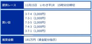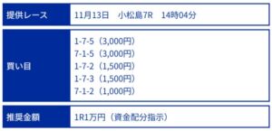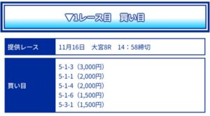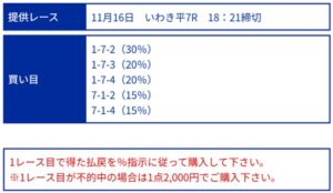 7戦3的中と的中率はやや低めも回収率は良いと言う感じで競艇よりは競馬に近い当て方ですね。