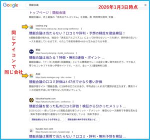 ちなみに今回検証依頼頂いた競艇会議ですが、柳生が無料予想の検証を始めた時点で検索上位のムサシ屋と同じアイコンで同じ運営の舟研に掲載があります。